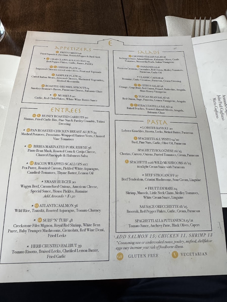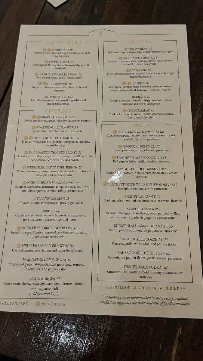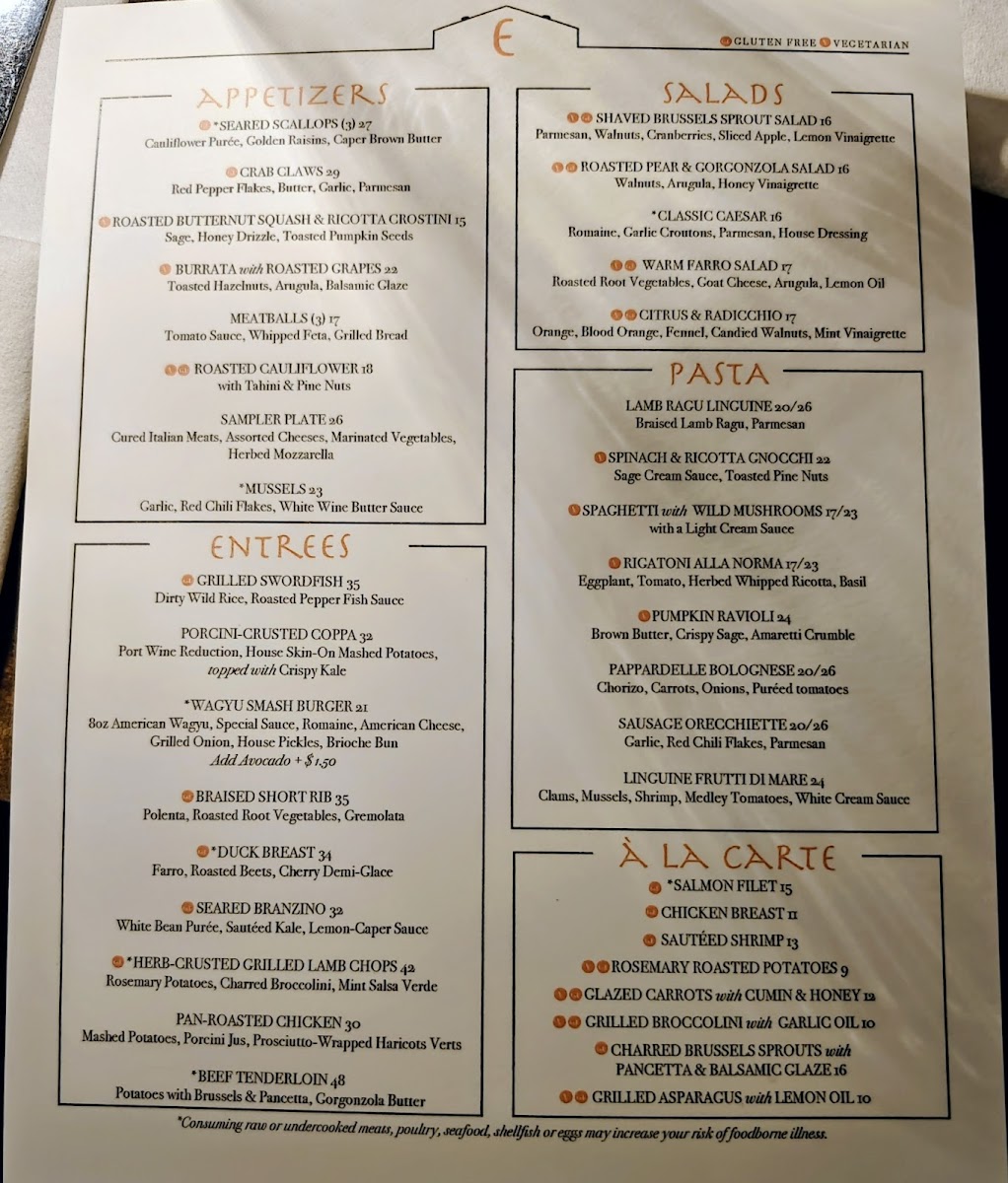 Guests can enjoy standout dishes like the Butternut Squash Ravioli or Spaghetti with Wild Mushrooms, which pair well with the restaurant’s welcoming atmosphere. Light starters such as the Burrata Salad or Charcuterie Board complement the main courses, making the menu well-suited for sharing and savoring over good conversation.